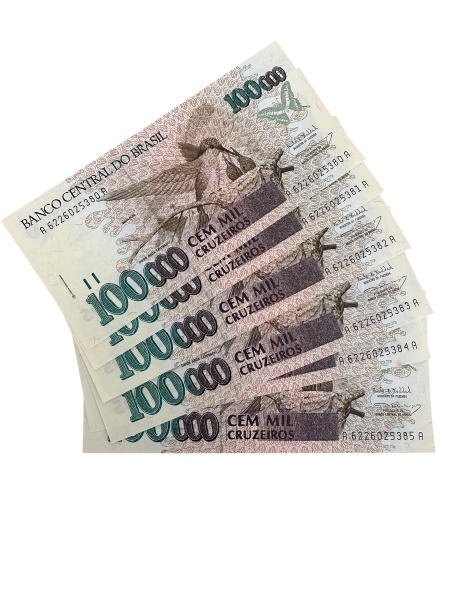 • Brasil - 100.000 CRUZEIROS SÉIRE A6226  A - FLOR ESTAMPA - 5 CEDULAS SEQUENCIAIS